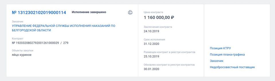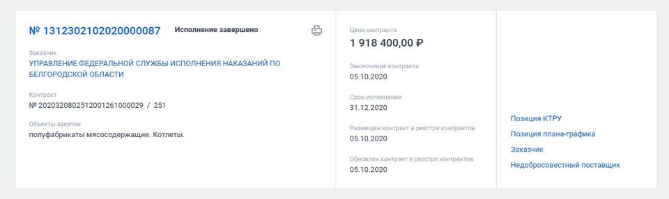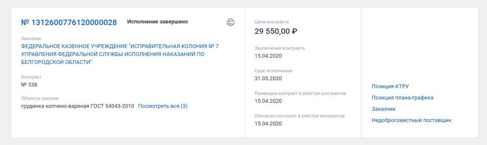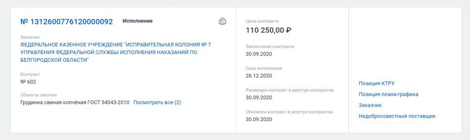 Здесь контракты не такие крупные, но вы просто представьте, что всё это производится внутри колонии: копчёная свиная грудинка, копчёное сало, 200 тысяч куриных яиц (вот это курятник в ИК-7), котлетки, рыбные котлетки и ещё много чего. Супермаркет от УФСИН круче, чем «Пятёрочка»!