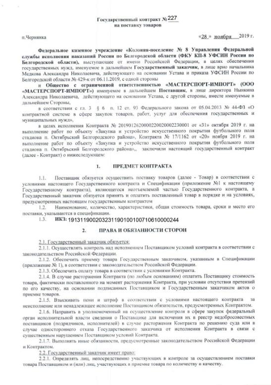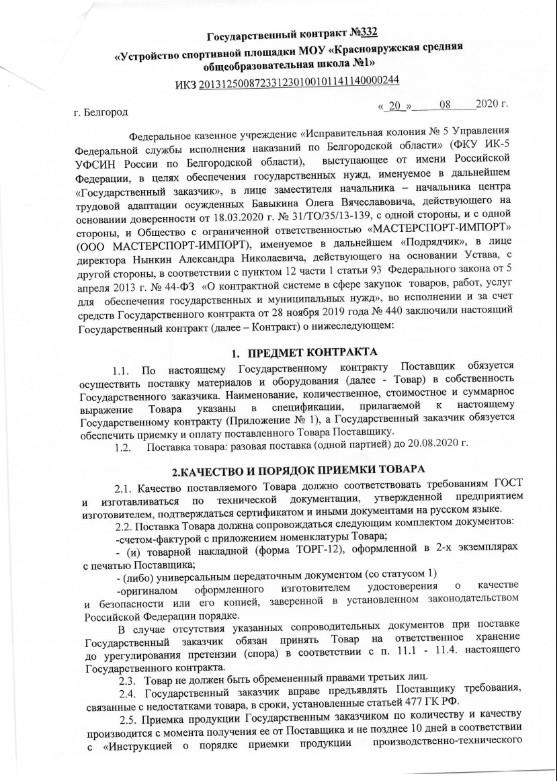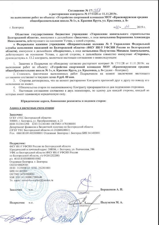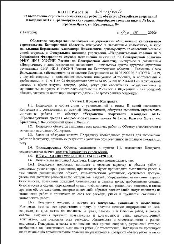 Департамент строительства и транспорта Белгородской области заключил контракт с ИК-5 на 36,8 млн рублей на строительство площадок ГТО. Всего в контракте указаны 18 площадок, значит, по 2 млн на каждую. Сколько стоит площадка ГТО в любой частной фирме из интернета? Самая крутая и оснащённая площадка стоит 1 млн рублей, а по скидке — да ещё и с доставкой — 637 тысяч рублей. То есть колония завысила цену в 2 раза, а бюджет потерял не менее 18 млн рублей только на этом контракте.