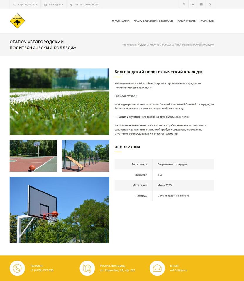 Почему мы пришли к такому выводу? А всё просто: компания «МАСТЕРФАЙБР-31» нам рассказала об этом на своём официальном сайте. По контракту, капитальный ремонт спортивной площадки Белгородского политехнического колледжа делал Производственно-промышленный дом ФСИН России. Но сайт компании говорит нам, что команда «Мастерфайбр-31» благоустроила территорию Белгородского политехнического колледжа, более того, там даже перечисляют проделанные работы.